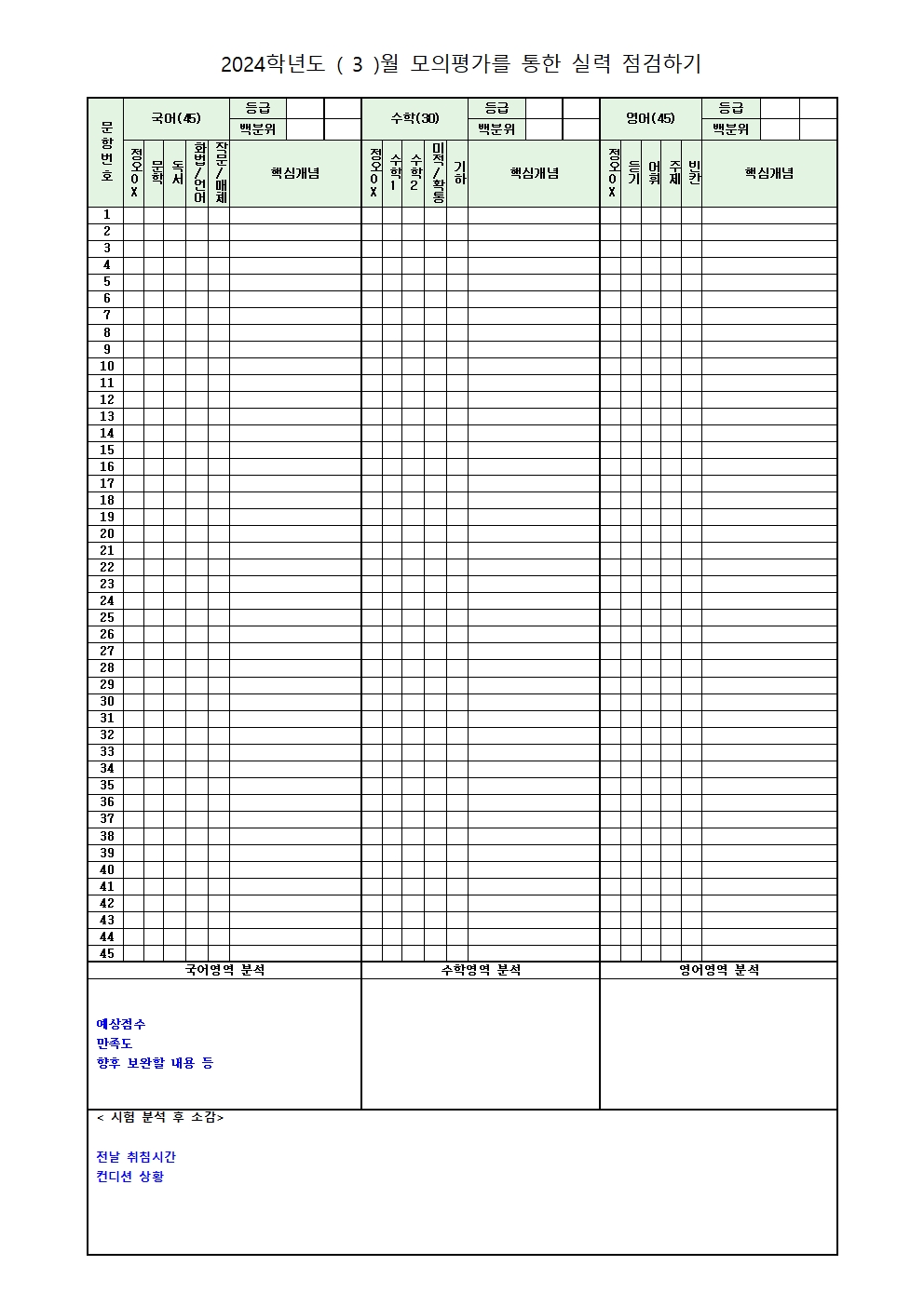과목별로 어떤 문제 유형이 취약한지 개념학습이 부족한 단원은 무엇인지를 찾아서 보완하는 학습 계획을 세울 때 도움되시라고 모의고사 분석표(점검표) 양식을 공유합니다.