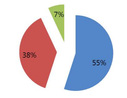 상대방과 의사소통을 할 때 대화의 내용은 7% , 상대방의 목소리는 38%, 바디랭귀지(표정, 태도)는 55%로 비언어적인 요소가 차지하는 비율이 93%나 됩니다. 즉, 효과적인 의사소통을 할 때 비언어적 요소가 더 큰 영향을 미친다는 것으로 이를 '메라비언 법칙'이라고 합니다.