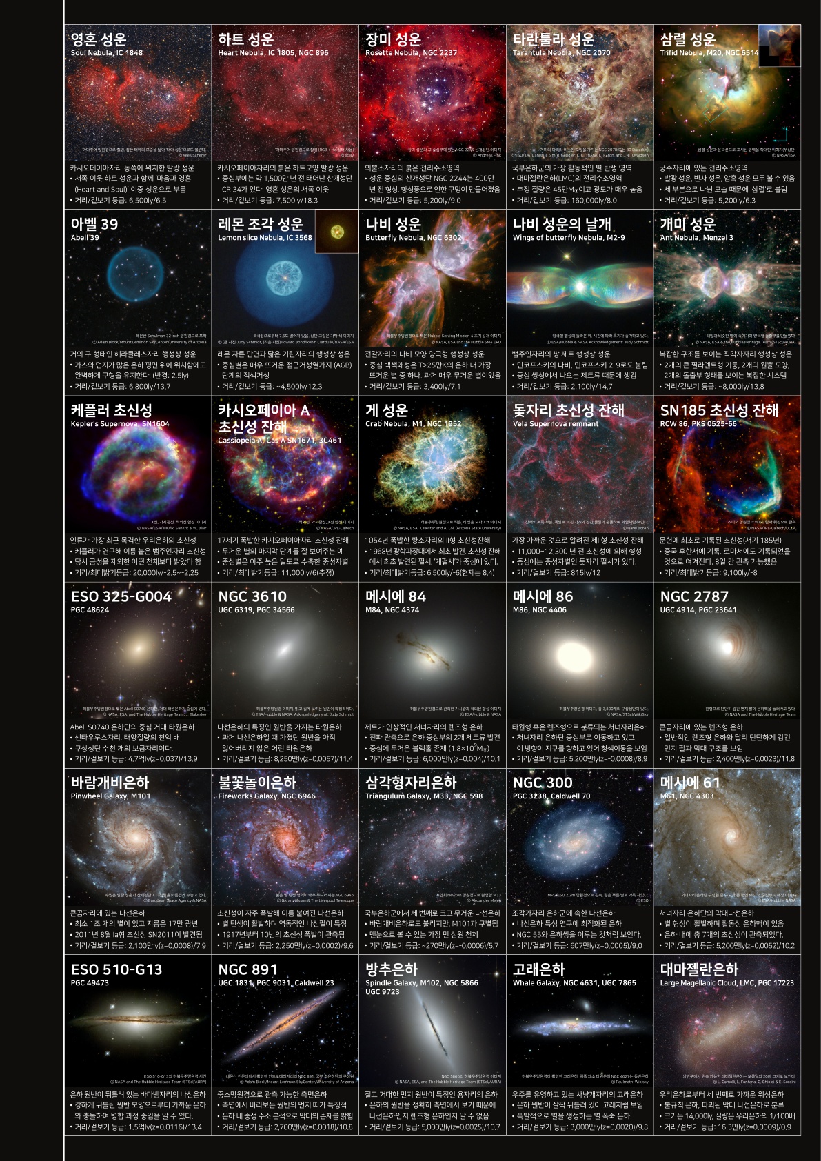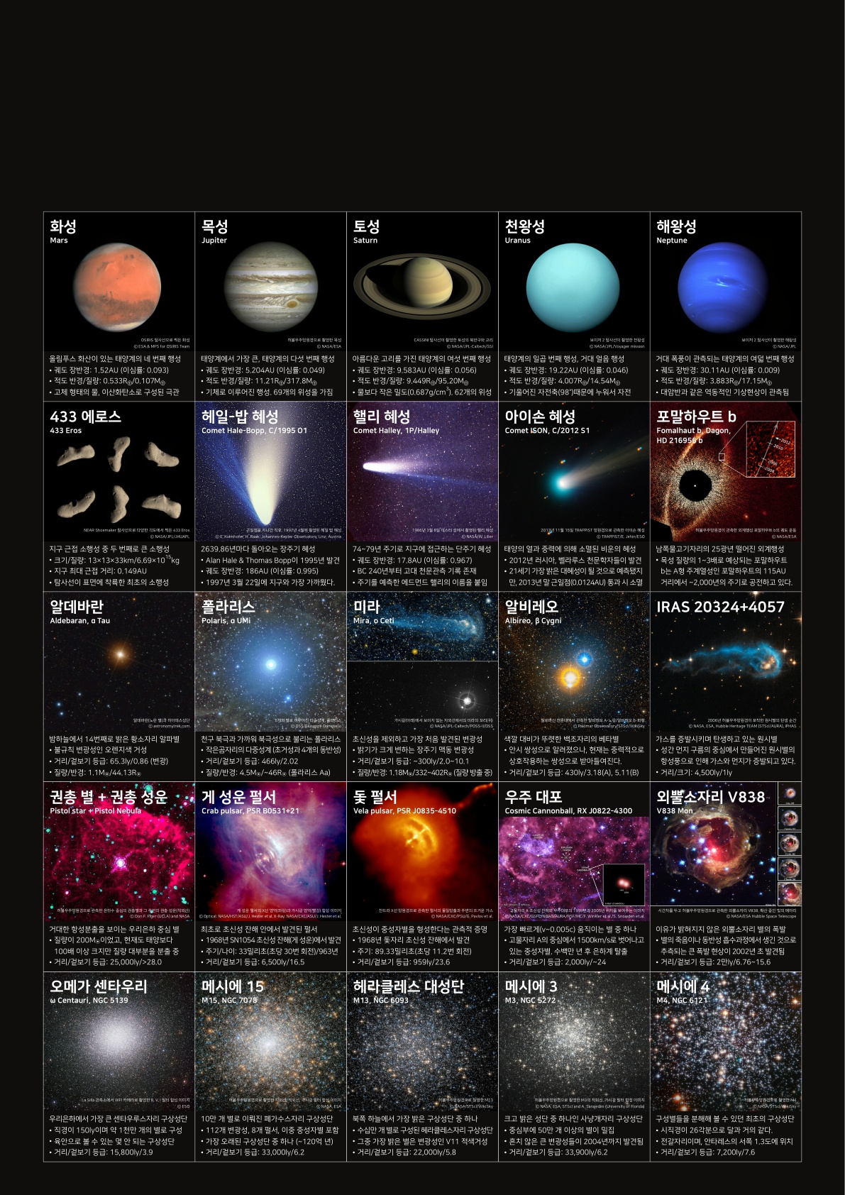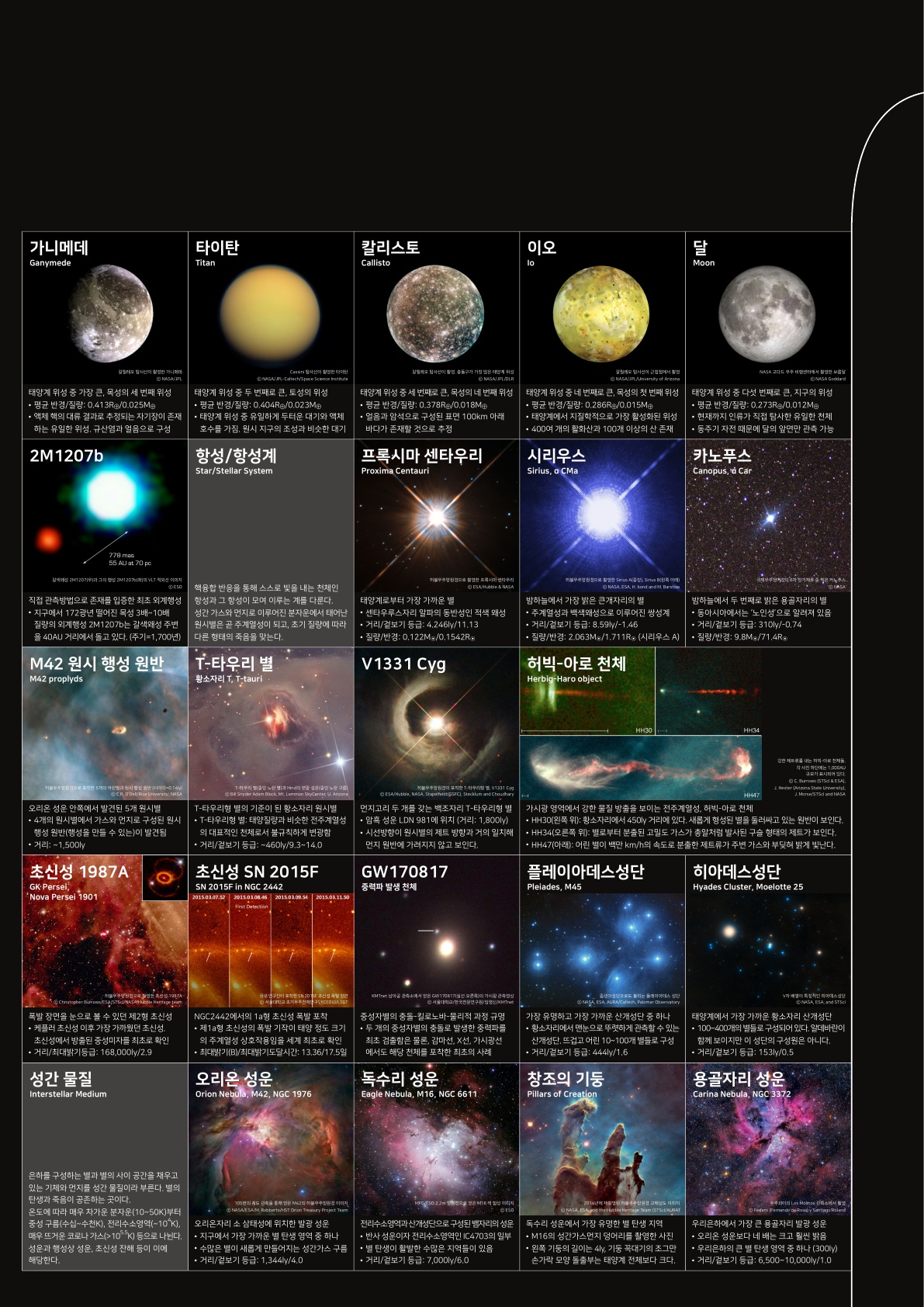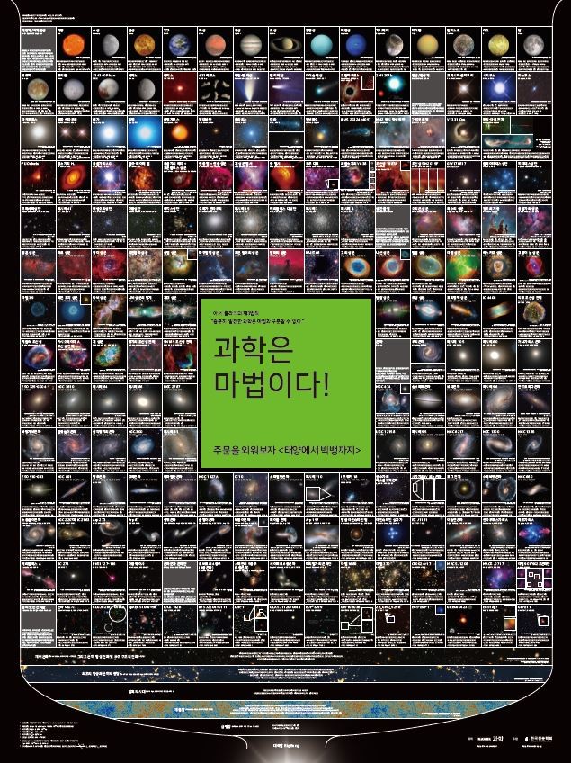 가까운 태양부터 지금까지 발견된 가장 먼 은하인 GN-z11까지, 180여 개 천체의 특징을 담고 있으며 서울대학교 초기우주천체연구단 현민희 연구원이 포스터 콘셉트와 내용을 집필하였다고 합니다.