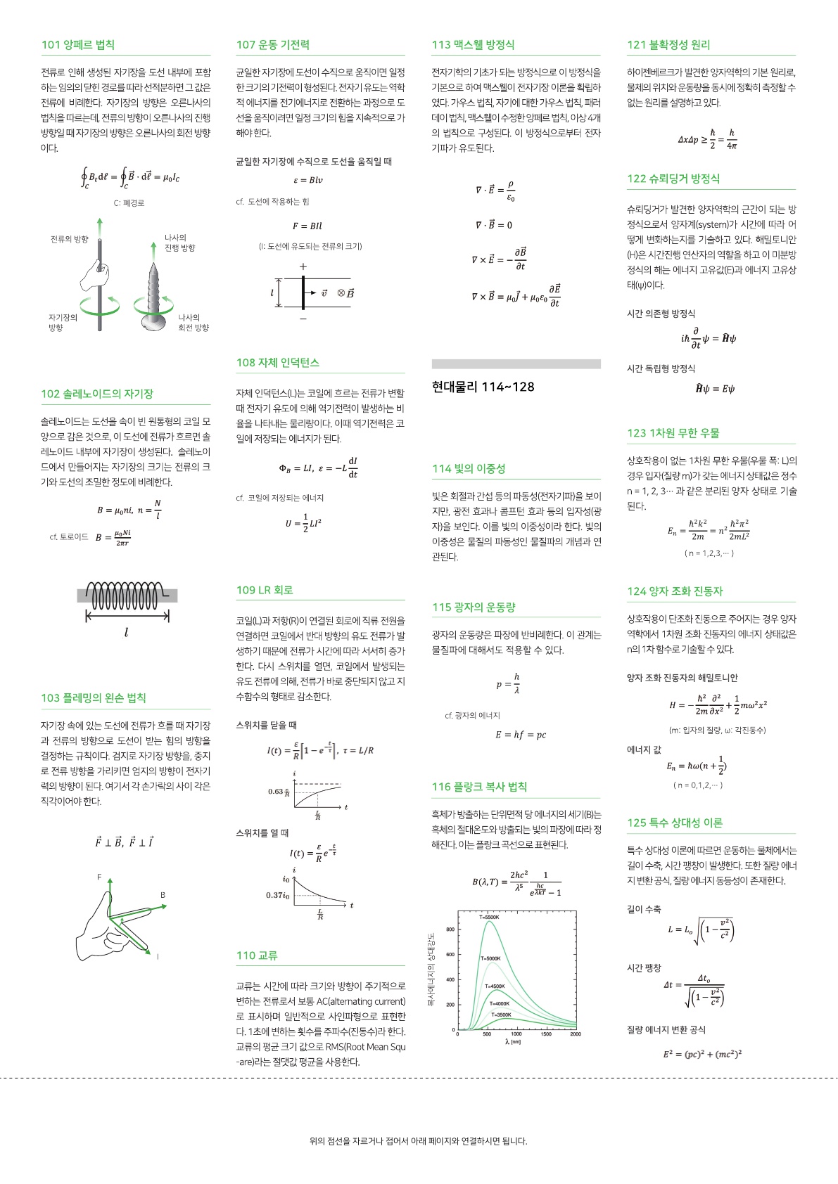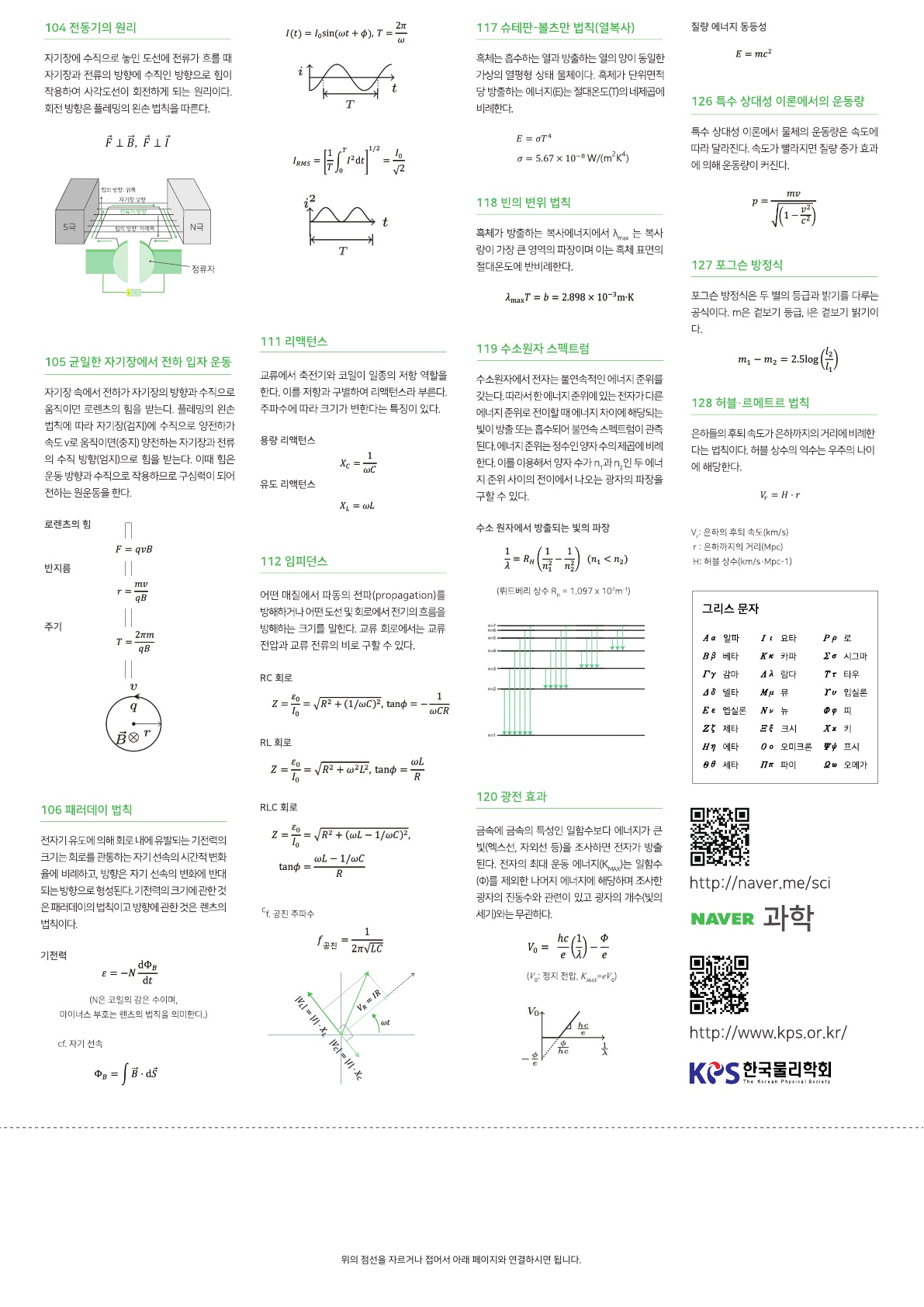 빛의 에너지부터 허블-르메트르 법칙까지 총 128개의 물리공식을 담은 포스터입니다.