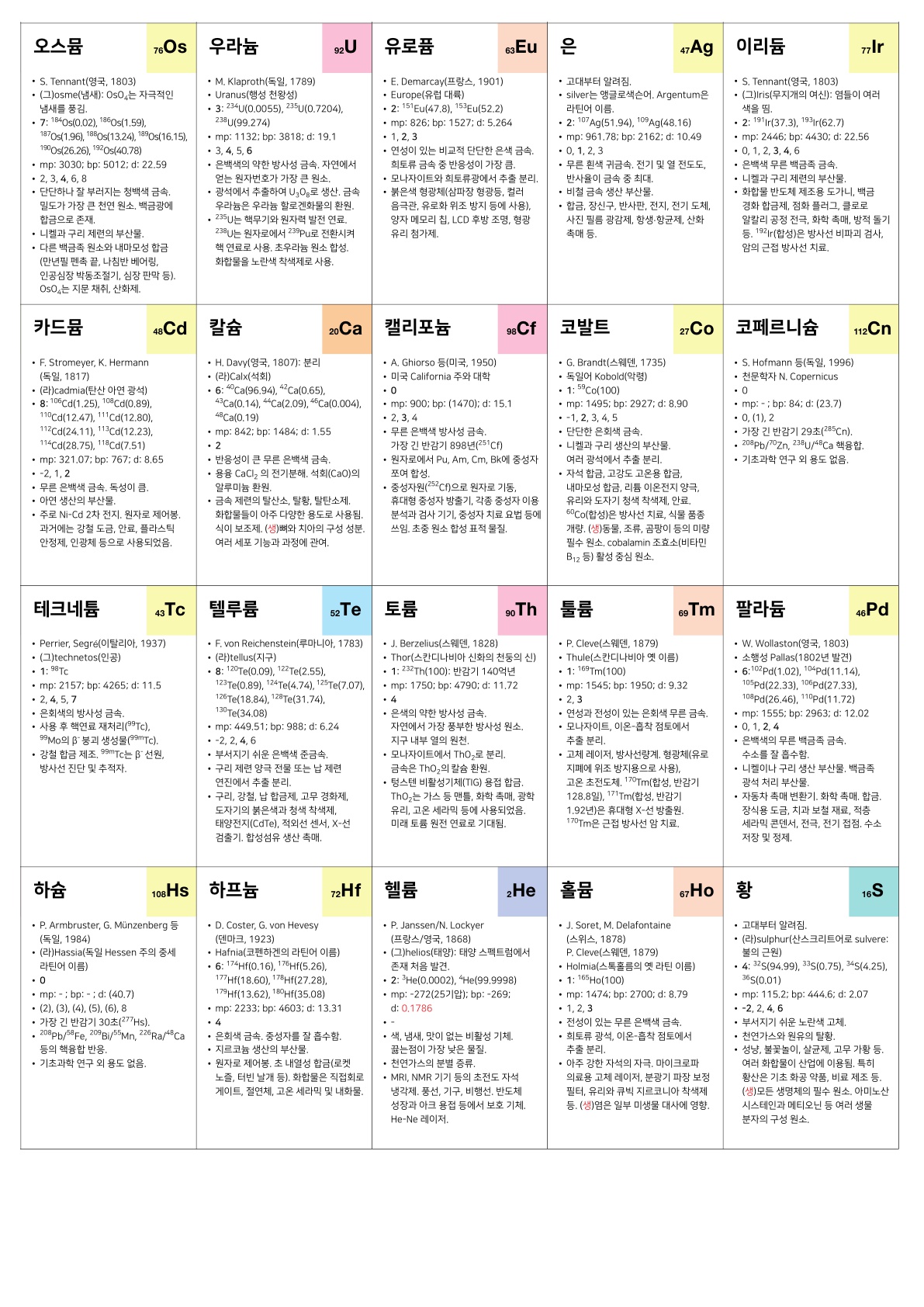원소기호와 번호, 표준 원자량, 전자배치, 전기음성도, 존재비, 발견자, 어원, 천연동위원소 수, 녹는점, 끓는점, 밀도, 주요 산화상태, 겉보기 및 특성, 생산 또는 합성법, 원소와 화합물의 주요 용도가 한눈에 펼쳐집니다.